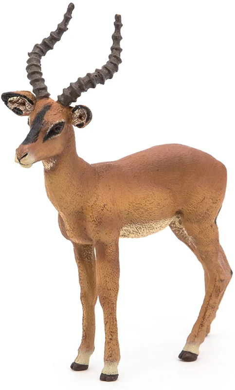 Het plastic speelgoed dier is prachtig afgewerkt door Papo. De impala is een antilope soort uit Afrika. Het is een slank hoefdier met een relatief lange nek. Het dier kan tot 80 kg wegen en leeft in open gebieden. Hier kan het roofdieren aan zien komen en op tijd vluchten.Â